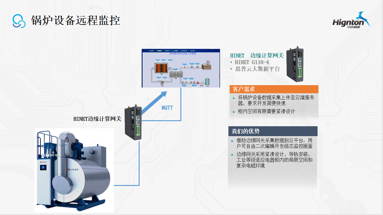 鍋爐作為工業生產中的重要設備,對其進行遠程監控和運維十分重要。在這個數字化時代,鍋爐與物聯網的結合可以大大提高鍋爐的運行效率和安全性。華辰智通是一家專注于網絡設備和物聯網技術的公司,我們可以為客戶提供高效的鍋爐遠程監控和運維方案。